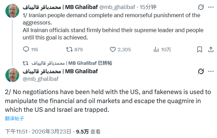 动作伊朗方面的恢复,伊朗伊斯兰议会议长卡利巴夫23日在支吾媒体发文,否定依然与好意思国举行讨论,真钱三公称这是用于阁下金融和石油市集的“假音信”。