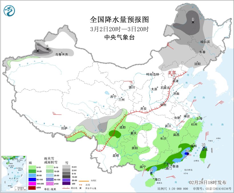 图4 寰宇降水量预告图(3月2日20时-3日20时)