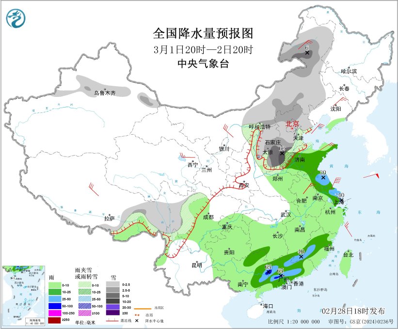 2月28昼夜间至3月2日,黄淮及以南地区有大界限降水,黄淮、江汉、江淮、西南地区东部、江南、华南等地的大部地区有中到大雨,真钱三公江南中南部、华南中北部等地部分地区有漫步性暴雨,局地伴有短时强降水、雷暴大风等强对流天气。
