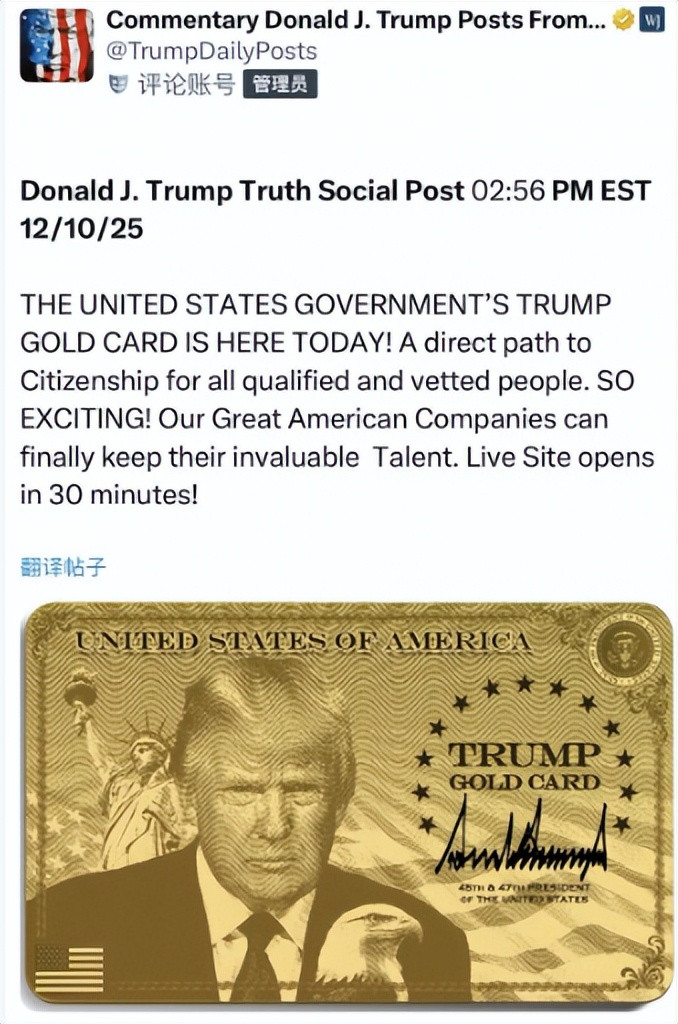 为了简略从“外侨”身上捞钱,在2025年6月时,特朗普政府曾颁布了一个极端的外侨金卡法案,即番邦东谈主在无偿交纳给好意思国五百万好意思元并通过无间审查后,就简略得益好意思国公民身份。
