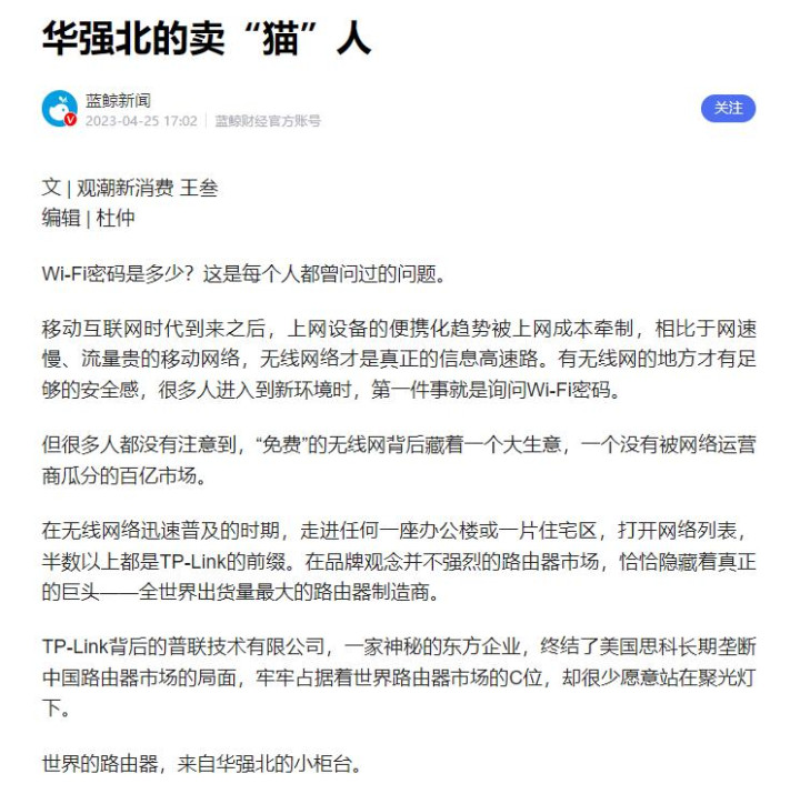 这位TP-Link CEO有何等听说呢?其名下研发的无线和宽带接入开辟出货量一度高居大师第一,果真是他亲手鼓励了当下wifi盛世的出现,以至于被多量东谈主敬称为wifi之王。