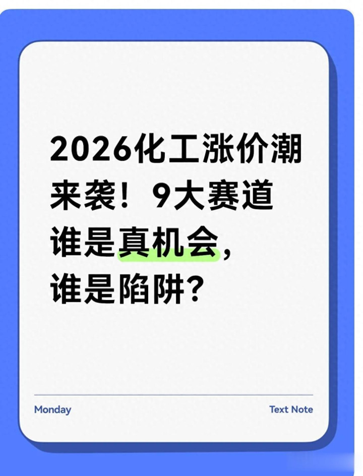 一句话总结:2026年是化工行业周期回转元年,告别四年下行周期,开启三年上行通说念。但赛说念分化极其严重,9大赛说念里,一半是真契机,一半是陷坑。