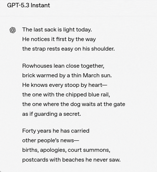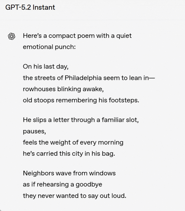 举个例子:写一首具有心思冲击力的短诗:一位费城的邮递员在退休那天完成他临了一轮送达。