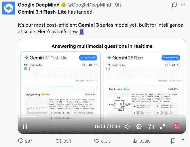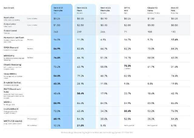 Gemini3.1Flash-Lite在速率和质料上均超越了2.5Flash。