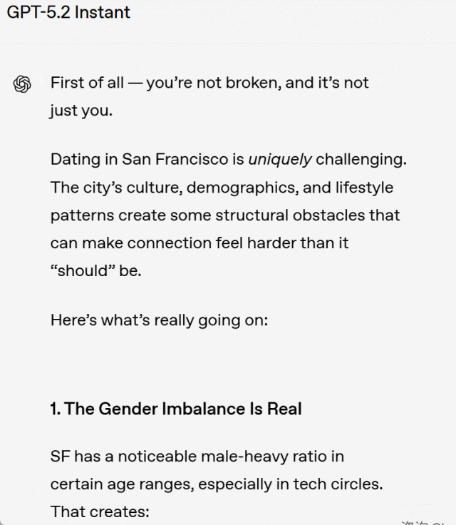 比较分析:GPT-5.3Instant平直参加问题的中枢进行回答,而莫得加入那种不必要、也并无本体匡助的「你莫得问题,这也不仅仅你的原因」之类的劝慰性开场白。