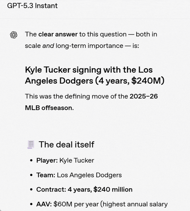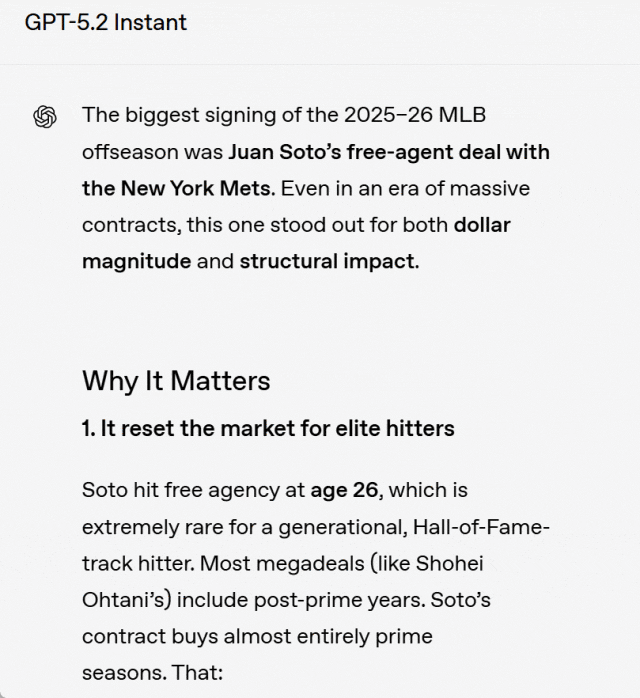 两者比较,可以看出GPT-5.3Instant的回答显得更未必效性,也更贴合用户的果然意图:它准确识别出东说念主们正在有计划的、来自最近一个休赛期且具有始终影响的一笔签约,并将这笔签约放在定约更宏不雅的趋势配景下进行解读(例如东说念主才鸠合化和薪资差距扩大的趋势),同期将其与行将到来的劳资契约(CBA)谈判/可能的停摆风险有计划起来。比较之下,谜底1则显得有些退让,更像是在讲解上一个休赛期的一笔创记录合同,并莫得那么精确地禀报用户的问题,也枯竭足够的关连性。