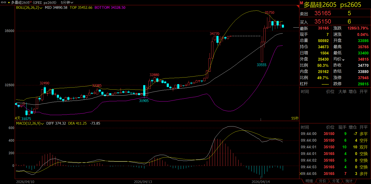 2026年4月14日,多晶硅期货价钱在资格昨日的剧烈波动后,当天开盘呈现低开高走态势,盘中一度跌近1%,随后强势反弹,日内涨幅跳跃4.00%,报35255元/吨。概括多家机构不雅点指出,本次价钱宽幅颤动的原因主要源于多进攻素的交汇博弈:领先是音书面的激烈扰动,对于龙头企业“闭门会议控产挺价”的传奇在昨日激勉商场拉升,虽随后被多家龙头公司辟谣,但仍余温未消;其次是本钱端的强力赞成,多晶硅价钱跌至3万元/吨区间已靠拢行业现款本钱极限,激勉空头减仓及短期底部企稳预期;临了是严峻的供需基本面压制,行业面对跳跃50万吨的总库存压力,且卑劣排产环比下降。在“传奇证伪”与“本钱赞成”的博弈下,商场激情呈现极大的不细目性。