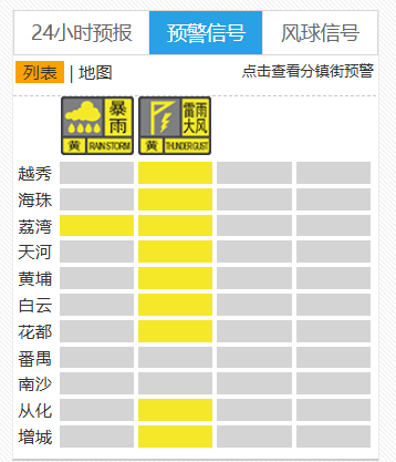 为止17时30分,越秀、海珠、荔湾、河汉、黄埔、白云、花王人、从化、增城已发出雷雨大风黄色预警信号,荔湾暴雨黄色预警收效。