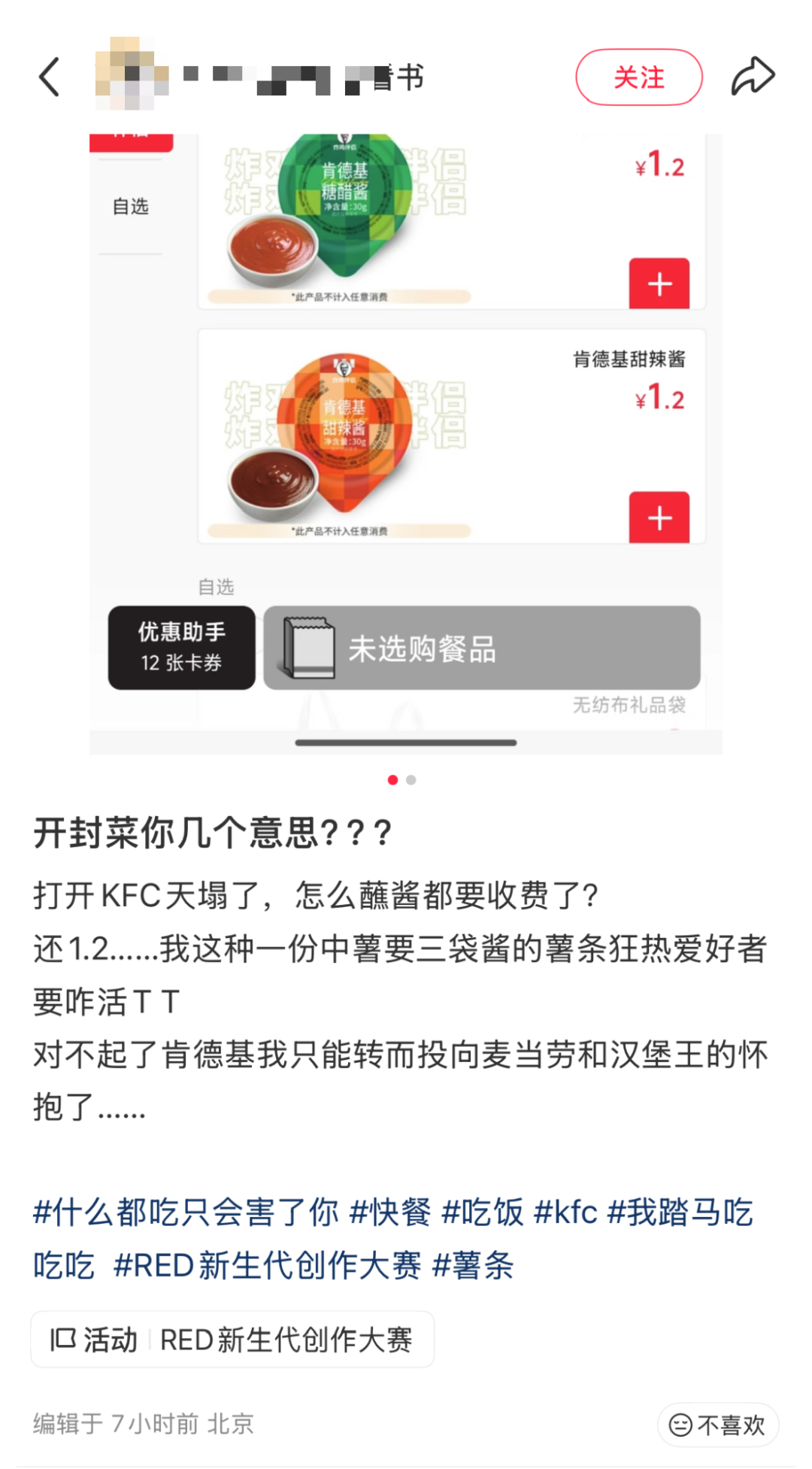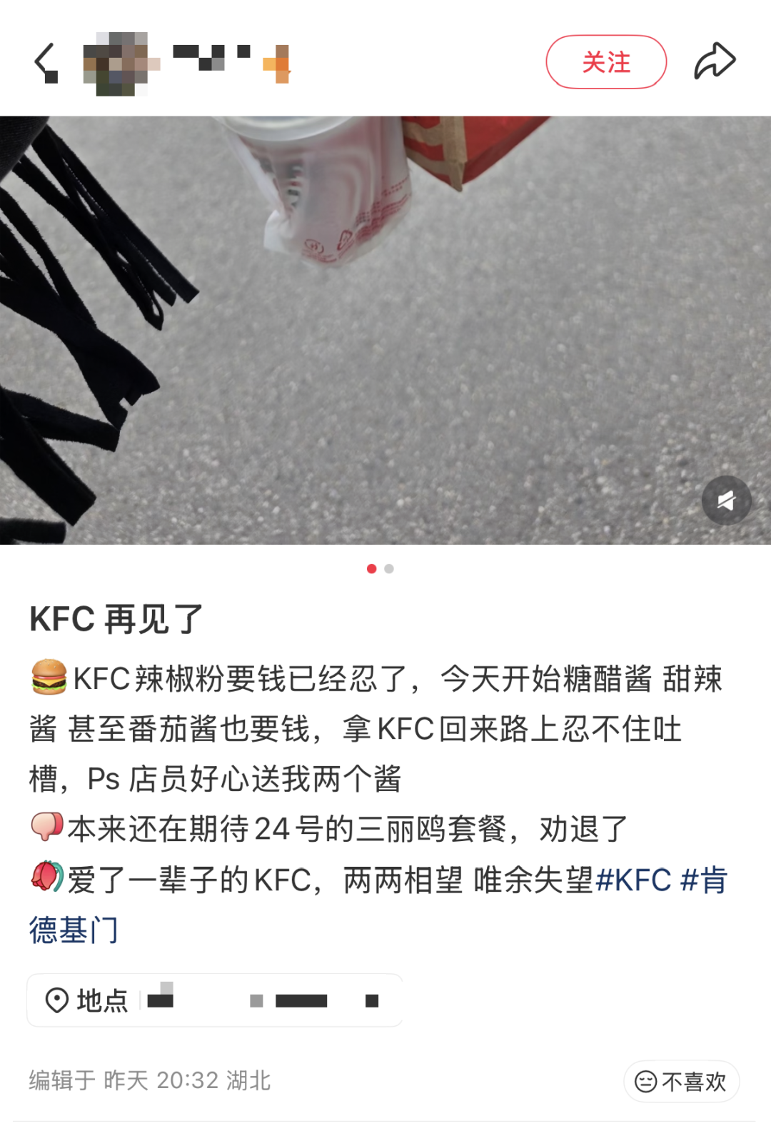 有肯德基伴计暗示,4月20日以后购买套餐里的免费蘸酱只可按量供给,朝上套餐圭臬的部分,需要付费购买。